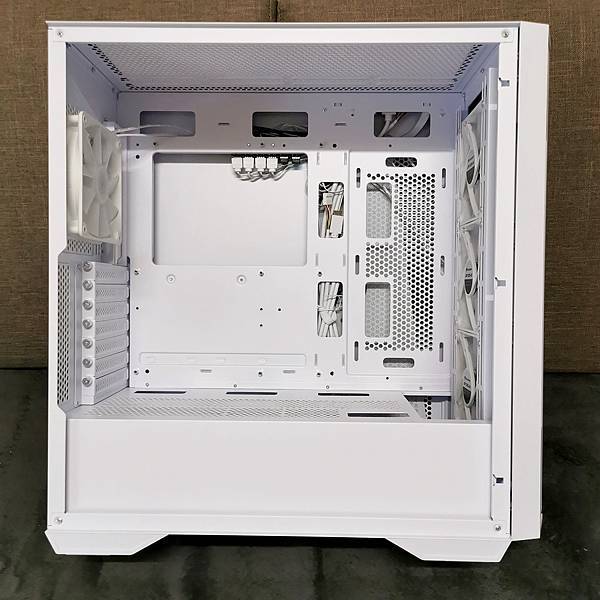 ▼ 機殼前方 內建三顆 120mm ARGB風扇,也可以更換使用水冷排;主機板側邊 也可再安裝二顆 120mm反向風扇,增加機殼內部進氣。