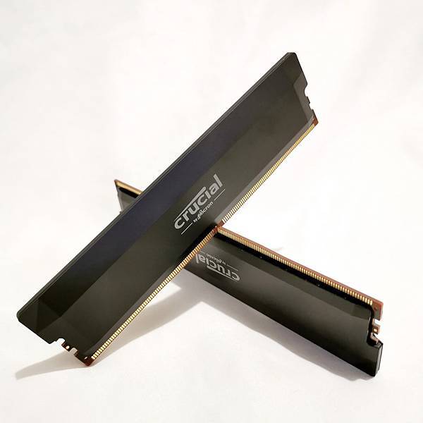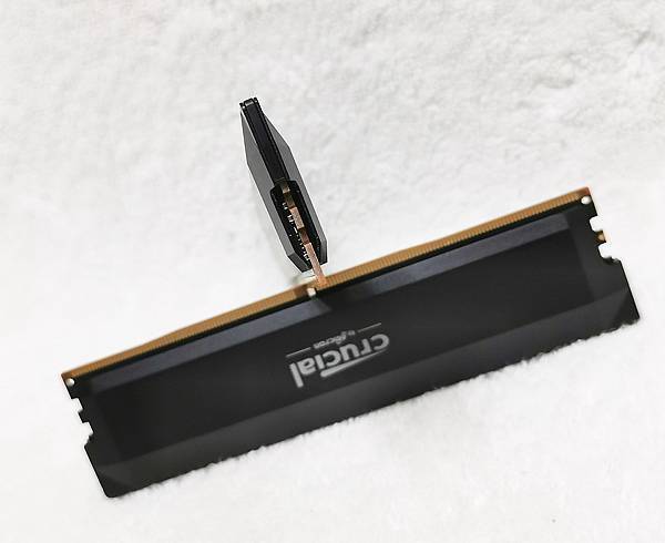 記憶體散熱片採用對稱式造型設計,造型時尚低調風格,記憶體正面有 Crucial LOGO。