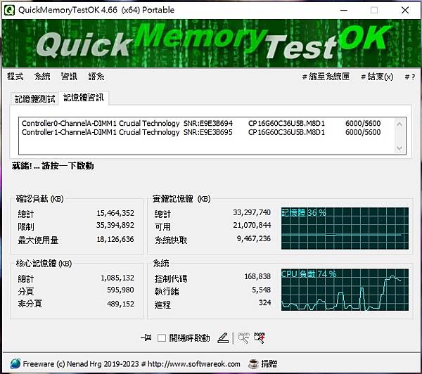 QuickMemoryTestOK記憶體檢測工具,可以查看記憶體資訊,測試後也完全正常。