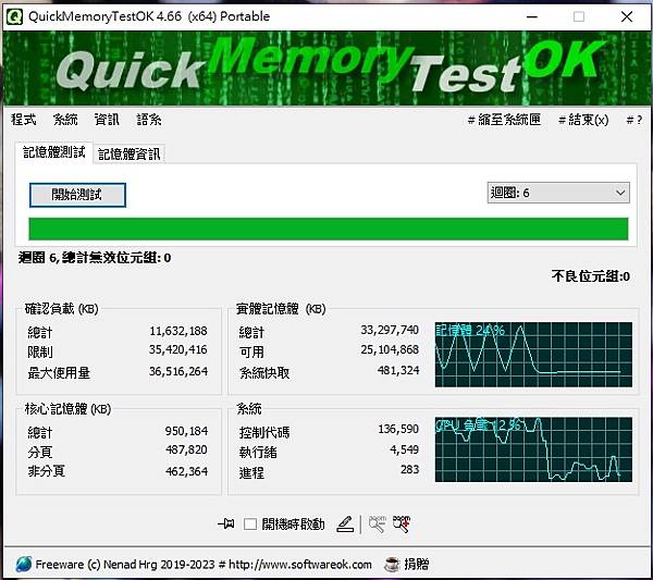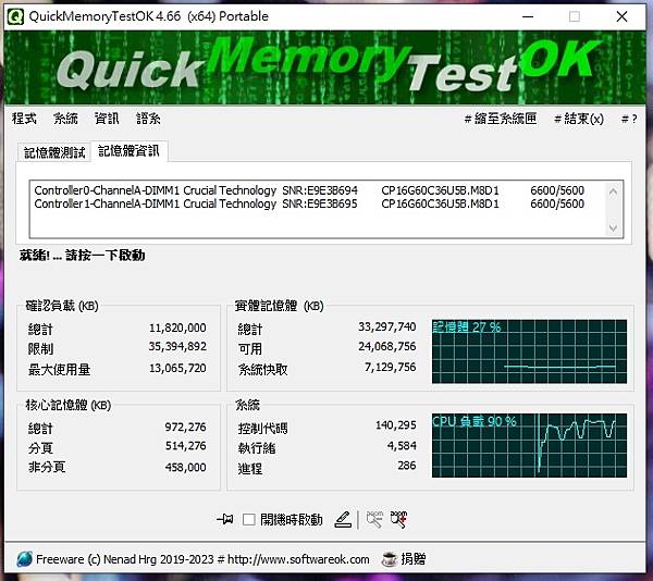 QuickMemoryTestOK記憶體檢測工具中,可以看到記憶體資訊顯示出已超頻至6600,經過測試後也是完全正常。