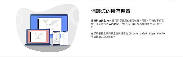 ▼ 電腦、手機和平板等裝置都可使用,支援 Windows、macOS、iOS 和 Android,安全並保護使用者的線上活動。