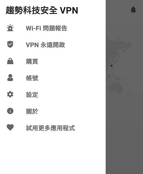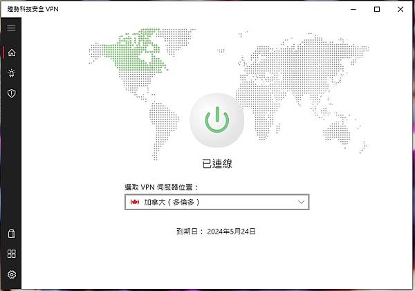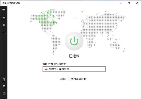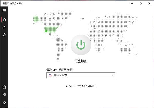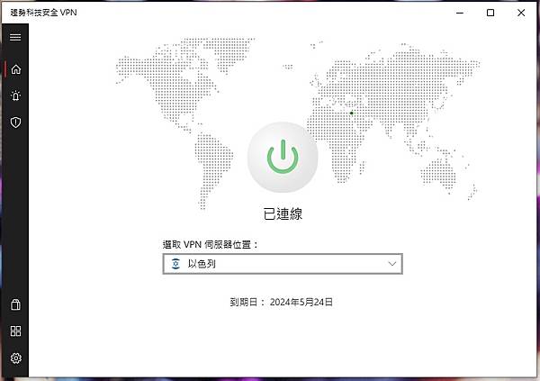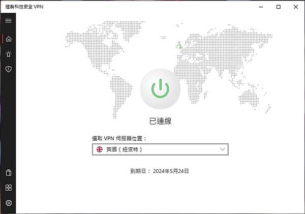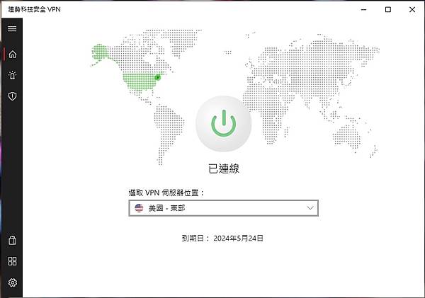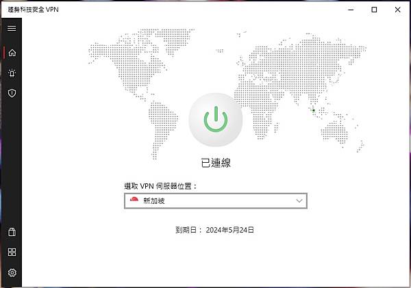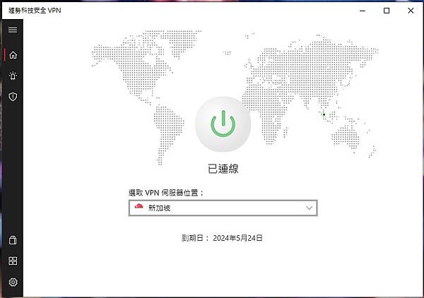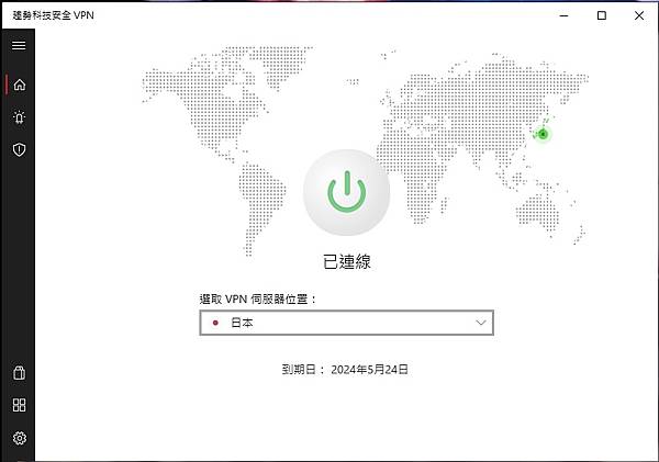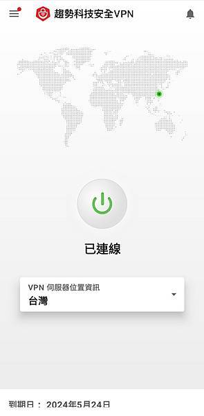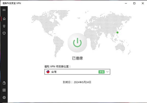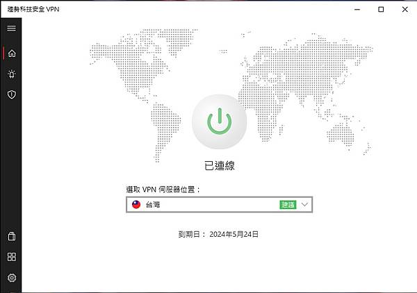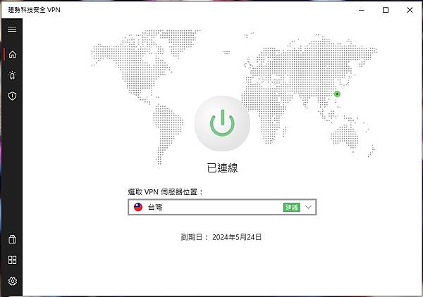 ▼ 首頁是一大張的世界地圖,中間電源符號綠色代表己經開啟VPN,建議的 VPN伺服器 當然是 台灣。