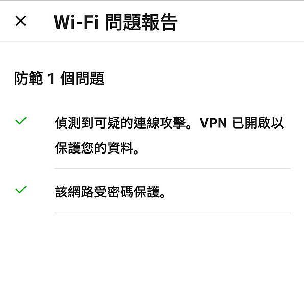 ▼ Wi-Fi 問題報告 - 可以看到有偵測到可疑攻擊,VNP 已經開啟保護,而且也偵測到我的網路是有密碼保護的。