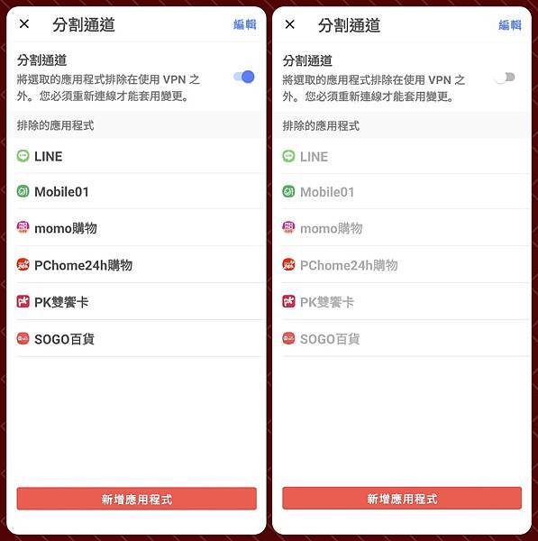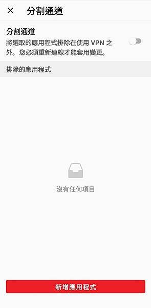 ▼ 有加入 分割通道的應用程式 就會列出來,臨時想要讓應用程式使用VPN,只需要一鍵關閉就好,非常的快速。