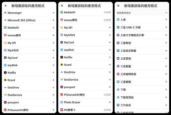 ▼ 點擊新增排除的應用程式,就會列出手機所有的應用程式,只要 點擊右邊的+ 就新增完成,最誇張的是連 系統應用程式 也可以排除在外。