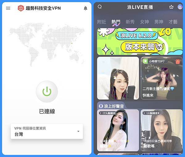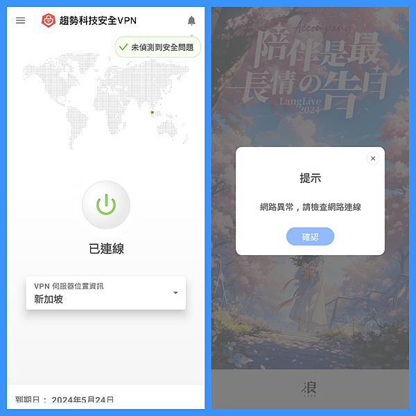 ▼ 此時將 VPN 切換至新加坡,再打開直播平台APP,則會顯示網路異常。