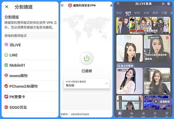 ▼ 此時把 直播平台APP,加入 分割通道 之後,就算 VPN 還是在 新加坡地區,已經可以正常觀看直播平台了。