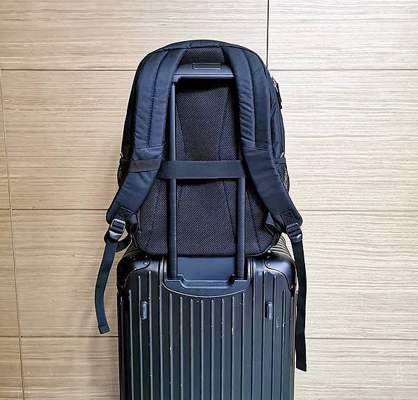 ▼ 塞滿滿的 Targus Ascend 15-16吋 進階電腦後背包,背包後面的 行李固定帶 可以輕鬆固定於行李箱。