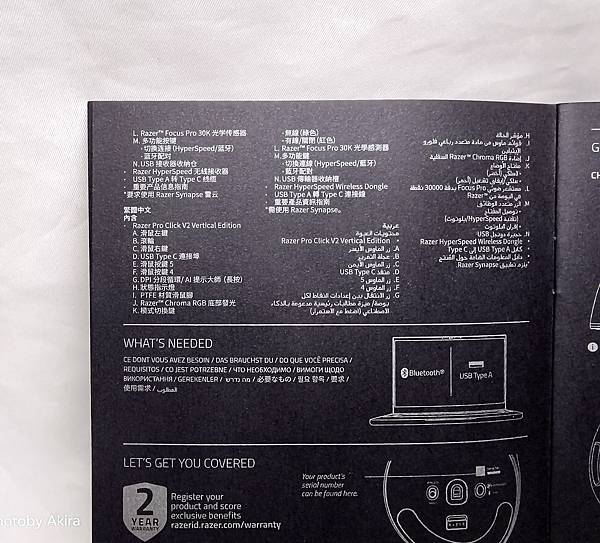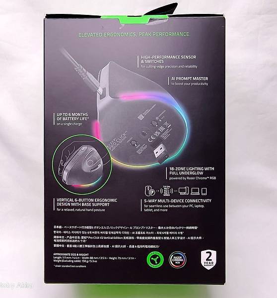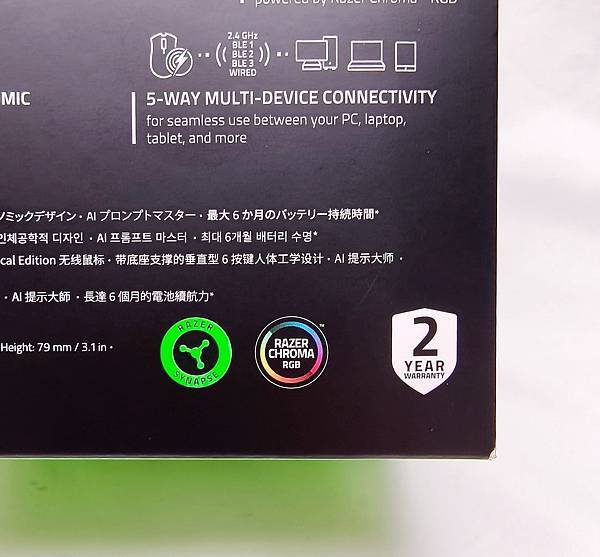 右下角 圖示有著 2年免費保固,支援 Razer Synapse、Razer Chroma RGB、