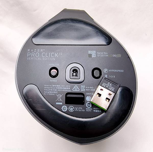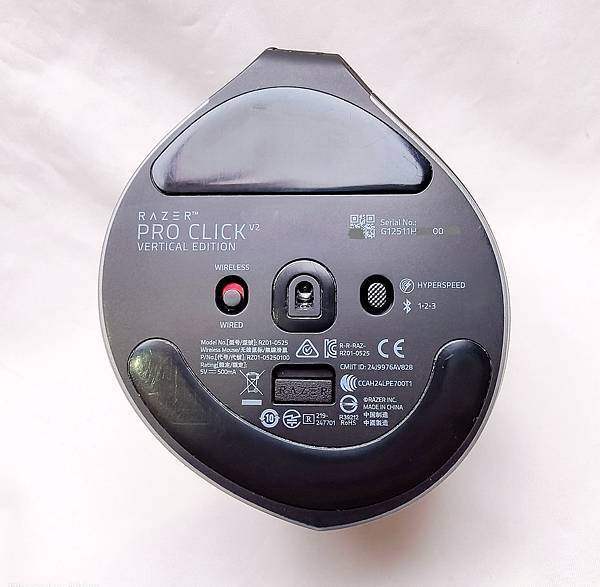 ▼ Razer Pro Click V2 Vertical Edition 底部 - 中間是 Razer Focus Pro 30K 光學感測器、左邊是 模式切換鍵、右邊是 多功能鍵。
