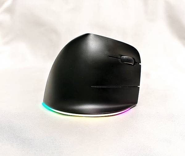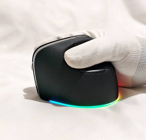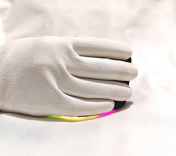 底部的全方位 RGB燈效,搭配底部支撐的掌托,剛好可以完整的呈現燈效,搭配有著RGB燈效的鍵盤跟滑鼠墊,實在是閃亮亮;另外在續航力方面,筆者燈光亮度設定100,智慧調光設定50%,整整一個月下來充電次數三次,可說是相當滿意,如果關閉燈效再使用藍牙連接,要達到幾個月的續航不是問題。