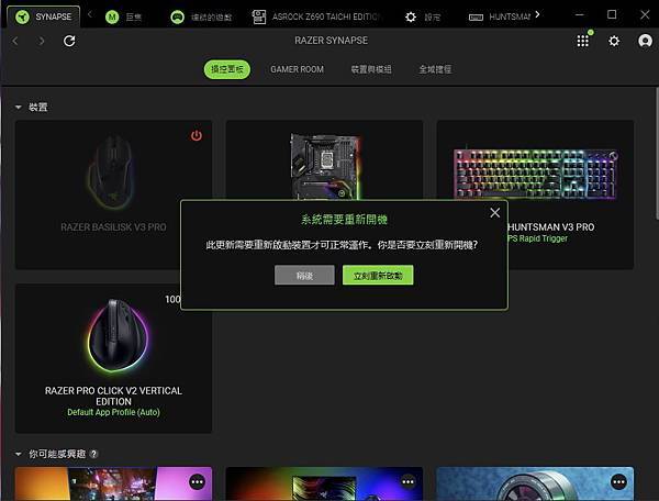 ▼ 系統安裝完 Razer Pro Click V2 Vertical Edition 會要求重新開機