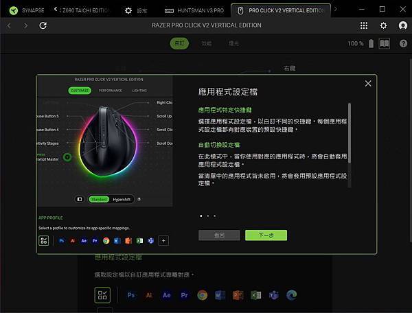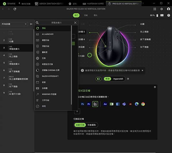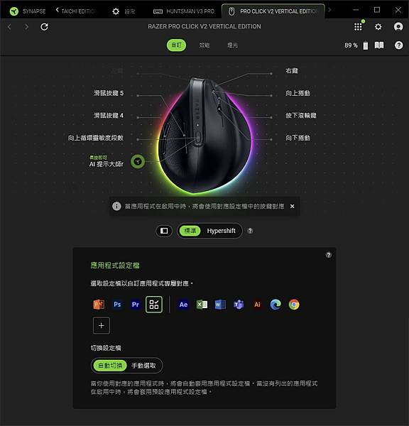 ▼ 在滑鼠自訂頁面,如果沒有指定程式,滑鼠按鍵會使用預設的設定檔;下方的切換設定檔建議自動切換就好。