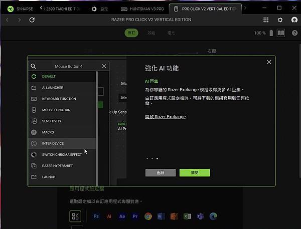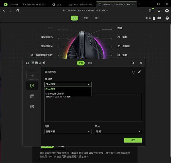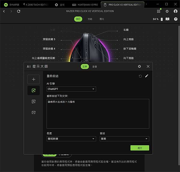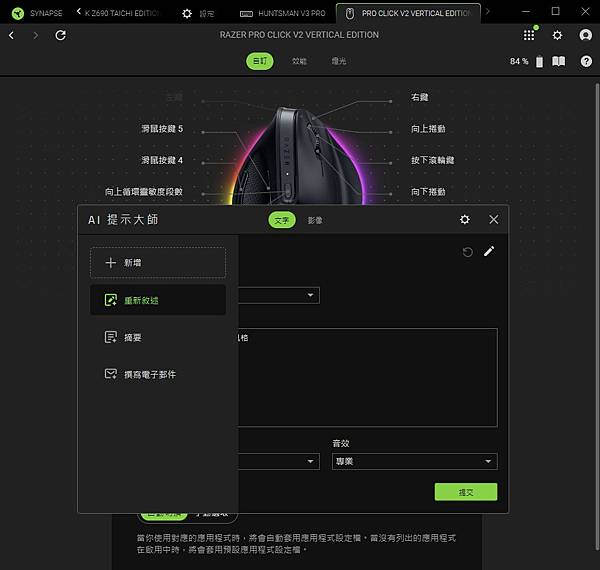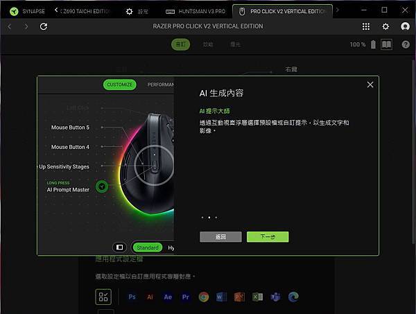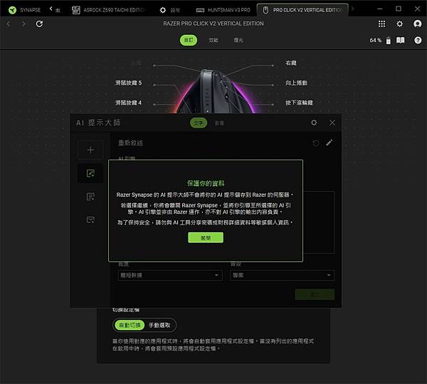 ▼ 點擊 Razer Pro Click V2 Vertical Edition 來設定,系統也會告知 AI 提示大師 並不會儲存任何資料到 Razer伺服器。
