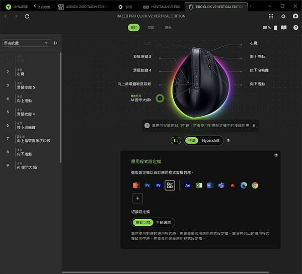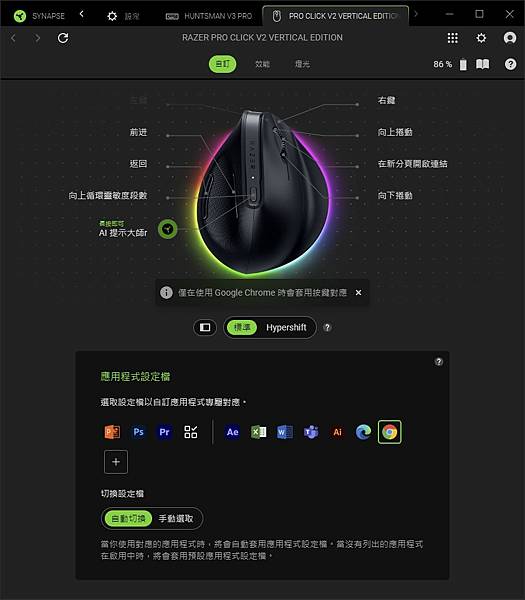 使用 Razer Pro Click V2 Vertical Edition 將近一個月下來,除了一開始的三、四天真的不太習慣,接下來的操作就完全正常了;舒適的人體工學設計,讓筆者手腕至手肘的痠麻有所改善,甩手的次數減少有感;應用程式專屬設定檔,確實提升工作效率,減少滑鼠頻繁移動;AI 提示大師 讓使用者更加便利,不需要另外多餘的操作,呼叫出來就可以直接下指令執行。