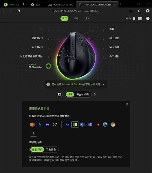 ▼ 應用程式設定檔 選擇 Microsoft Excel,可以看到有按鍵會自動切換成 Excel 常用的 刪除欄/列、插入欄/列、插入評論。