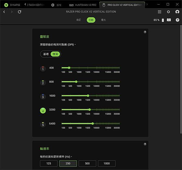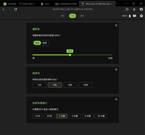 ▼ 效能頁面 提供 靈敏度、輪循率、無線省電模式 可以設定。