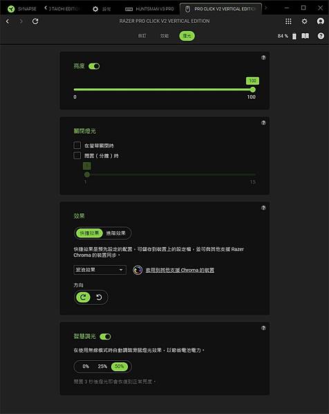 ▼ 燈光頁面 可以設定 燈光效果、燈光亮度及關閉燈光條件,智慧調光 則是設定 使用滑鼠時 降低燈光亮度,可以節省電力。
