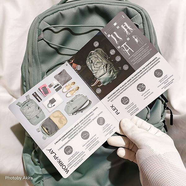 Targus Work+ Play Flex 吊牌,上面介紹其產品特色,另外圖示可以收納的東西及Multi-Flex織帶 拿來固定物品的使用方式。