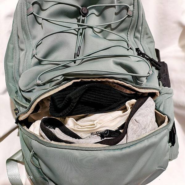 底層的部份放了 兩件衣服,隱藏式暗袋 則是放了 襪子。