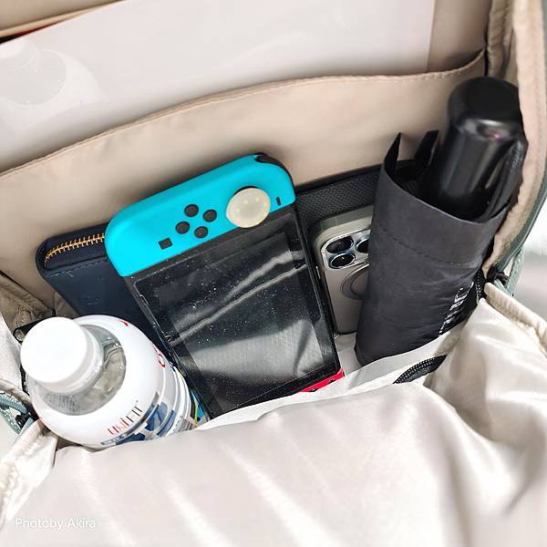 第二層的空間 立馬變大許多,除了原本放的物品外,另外放了飲料、Switch,甚至可以將雨傘也收進來。