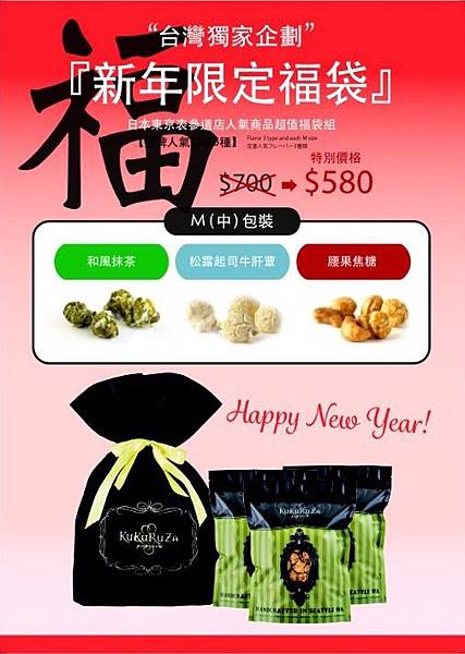 KuKuRuZa也為各位朋友準備多種禮袋組合,除了 1/27-2/14 推出每日限量50份的開幕優惠禮袋組合、賞味組合,聽說因應新年假期,從 2/6起至2/14 還推出了「新年限定福袋」呢!喜歡的朋友要快點去搶購喔!!!