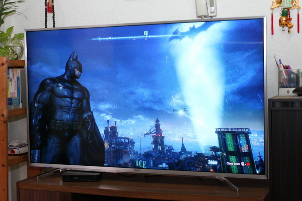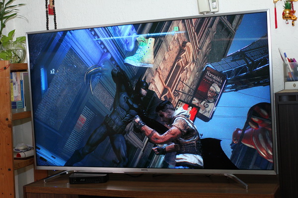 BenQ 55SY700 拿來玩超級大作,當然直接畫質最高、特效全開,與其自己窩在房間玩,不如在客廳大家一起享受。(照片只是示意,不用坐那麼近啦!)