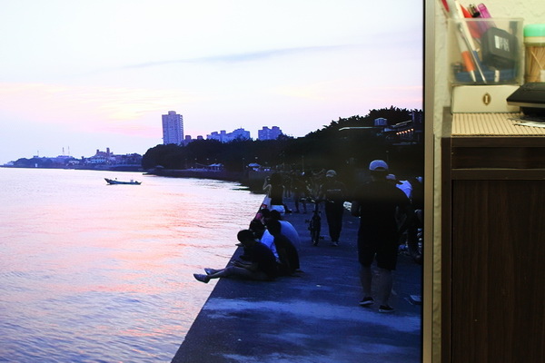 淡水夕陽餘暉照片:仔細看右邊的人群部份,灰色的水泥地及散步的人群 清清楚楚。