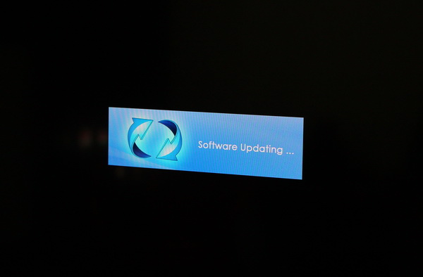 按遙控器 "電源"鍵 開機後放開,並立刻按住遙控器的方向鍵的 "上"鍵 不放,一直到螢幕出現 "Software updating..." 的小畫面 再放開。(照片取自官方文件)