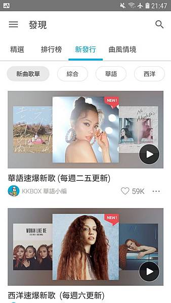 KKBOX的分類非常的細,《精選》《排行榜》《新發行》《曲風情境》,就可以看到有非常多的歌曲可以選擇。